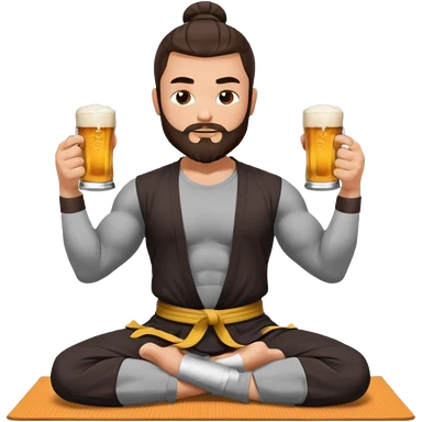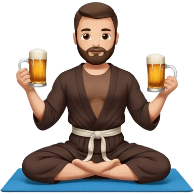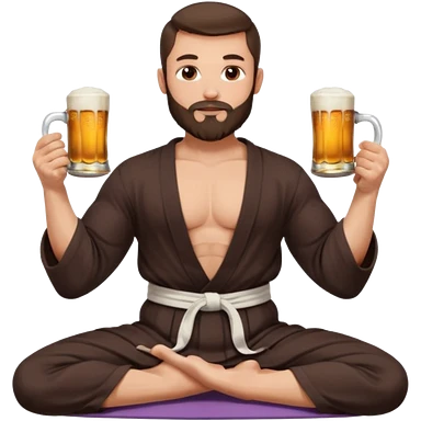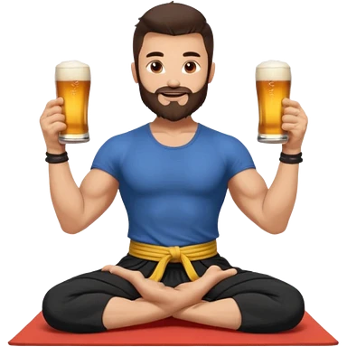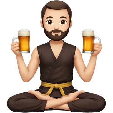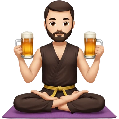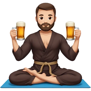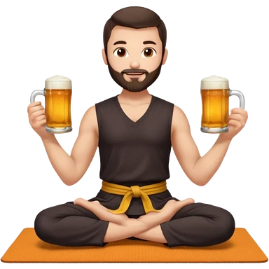slavic guy with dark brown hair and beard, sitting in yoga pose on a mat, kung fu clothes, short dark hair, holding beer mugs in two hands, sitting emoji