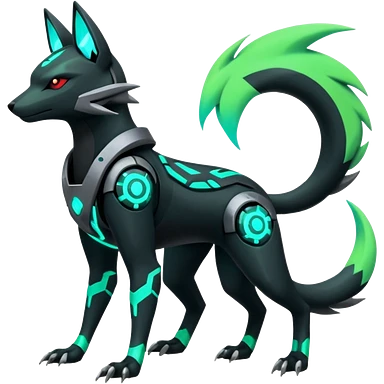 Black and green cyberpunk intricate neon glowing grey white futuristic cyborg-Zeraora-Zoroark-Umbreon-Litten-Salandit-fusion (full body) emoji