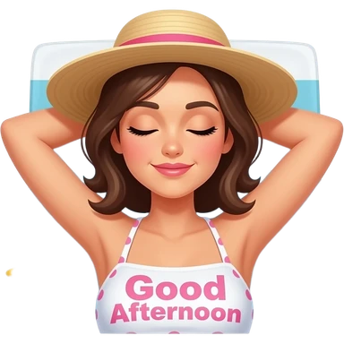 A bikini woman wearing a sun hat lying down on a beach towel tanning on the beach with eyes closed and the words 'Good Afternoon' in pink printed across emoji