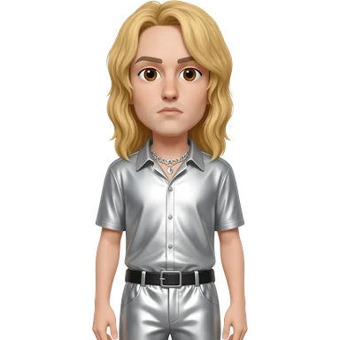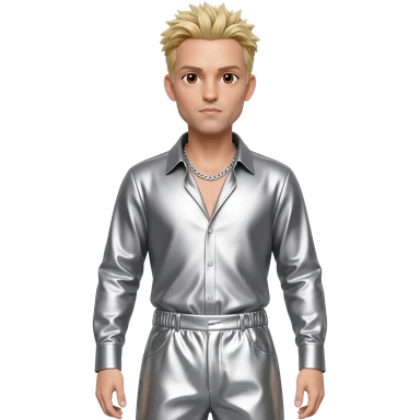 Bill Kaulitz with brown eyes, blonde hair, silver metallic shirt, silver metallic baggy pants, silver necklace emoji