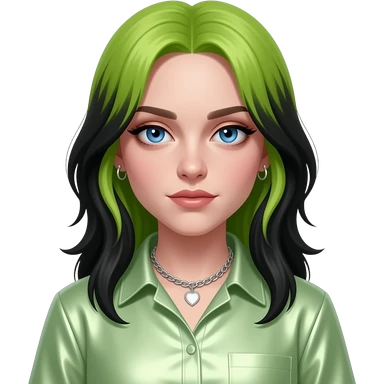 Billie Eilish with blue eyes, long lime green and black hair, light green metallic sweetheart shirt, silver necklace and short earrings emoji