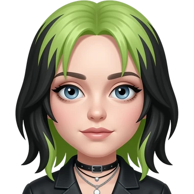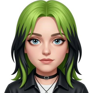 Billie Eilish with blue eyes, long lime green and black hair, light green metallic sweetheart shirt, silver necklace and short earrings emoji