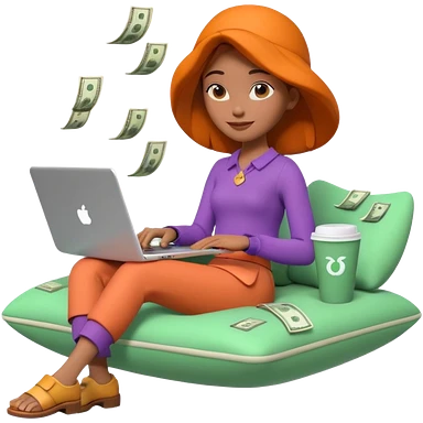 3D clay character relaxed with laptop and coffee, floating icons (hearts + dollars), colofrful modern outfit, white laptop, Pixar style, transparent background emoji