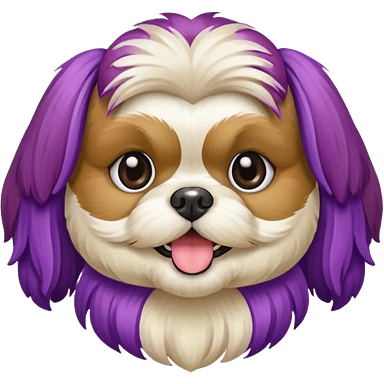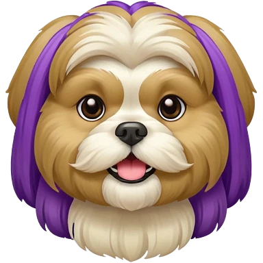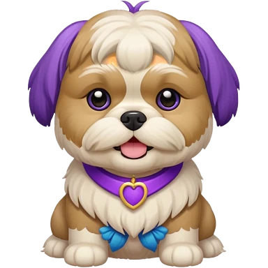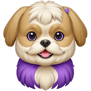 generame la imagen de un perrito raza chitzu de color cremita, totalmente cremita sin esos colores marron oscuro en su cara, hazla un poco sonriente y con su pechera morada emoji
