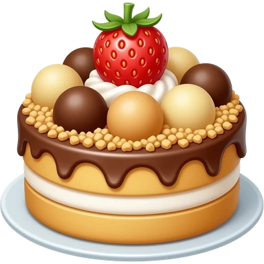 biscuit balls on cake with strawberry/chocolate/vanilla topping + crumbs topping emoji