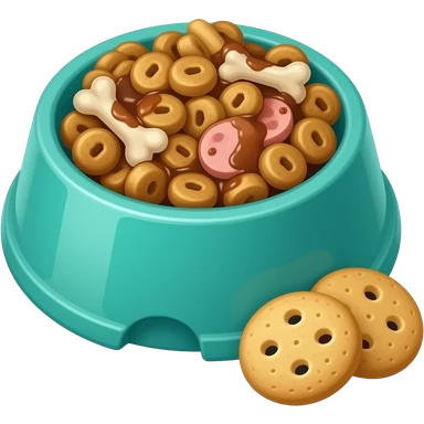 Apple emoji style 3D icon. Teal dog bowl filled with kibble, meat in gravy, and bone biscuits. Two separate biscuits next to it. Realistic textures. Isolated on light grey. emoji