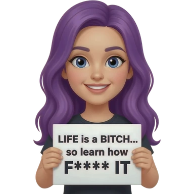 girl with long purple hair holding a LIFE is a BITCH... so learn how to F*** IT sign emoji