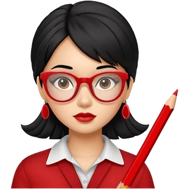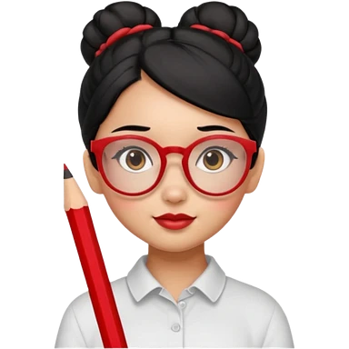 Morena girl with black hair that's in a bun style, with a pencil holding the bun in place. she has a cute rectangular red glasses emoji