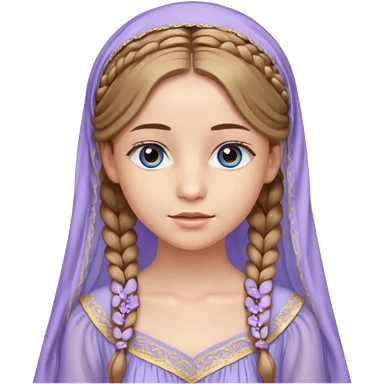 Joven de unos 20 años, de aspecto dulce y elegante. Piel clara, ojos expresivos (pueden ser azules o verdes) Rubio o castaño claro, largo, con trenzas o velo. Vestido largo de tonos suaves (blanco, azul o lavanda), con bordados dorados; un manto o toca fina cubriendo la cabeza. emoji