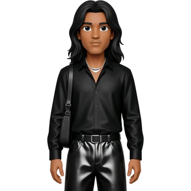 Bizzy Bone with light tan skin, long black hair, black metallic shirt, black metallic baggy pants, silver necklace emoji