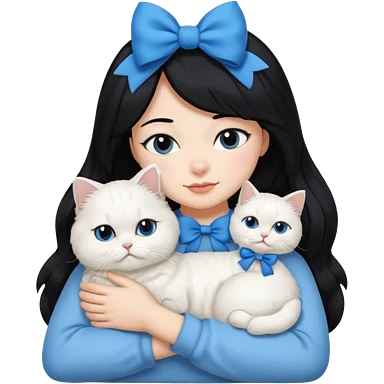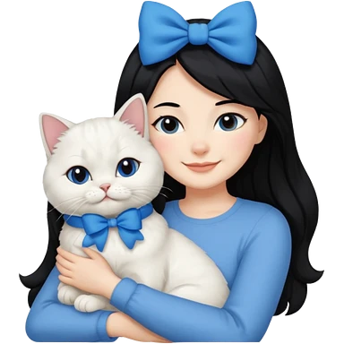 black hair woman snuggling white Persian cat with a blue bow emoji