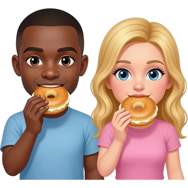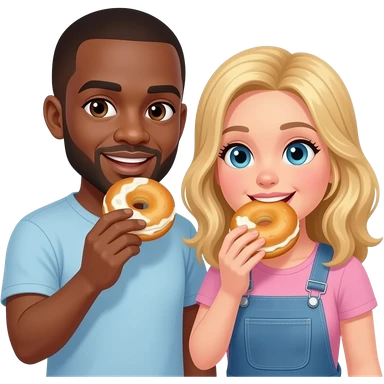 Black man with shaved head & blonde girlfriend eating bagel with cream cheese together emoji