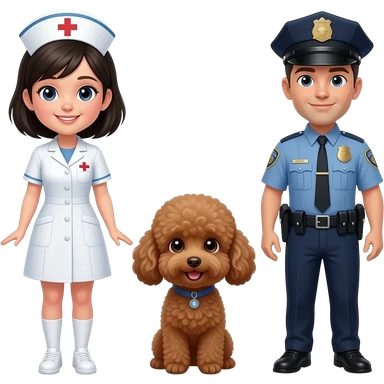 black hair girl that’s a nurse with black hair guy who is police officer with their poodle mini brown emoji