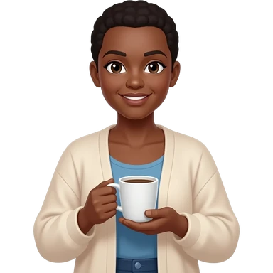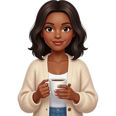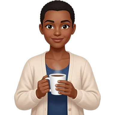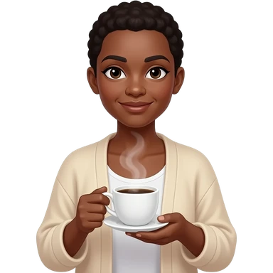 BLACK BALD WOMAN WITH SHOULDER LENTH HAIR IN FLOWY CARDIGAN HOLDING A CUP OF COFEE emoji