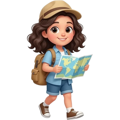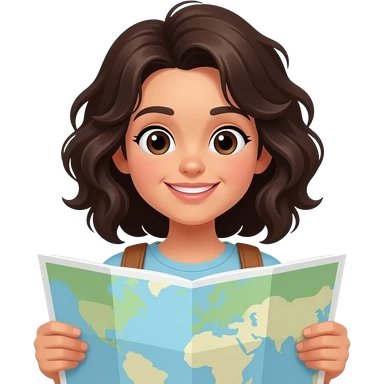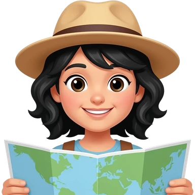 black hair, white skin, wavy hair tourist with maps travelling emoji
