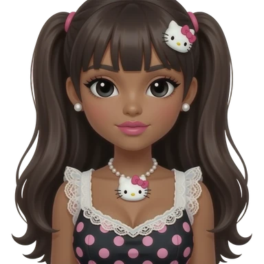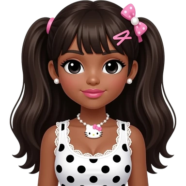 black girl, black eyebrows, pearl earring studs, black girl, pink lips, my melody hairclip, dark brown skin, Doll faced shaped, hello kitty necklace, bimbo, black doll eyes, Big lips, long dark brown hair, with white or black lace baby pink polka dots with gyaru sleeveless shirt, with big breast emoji