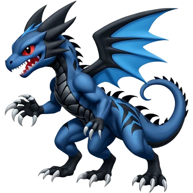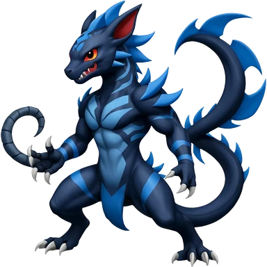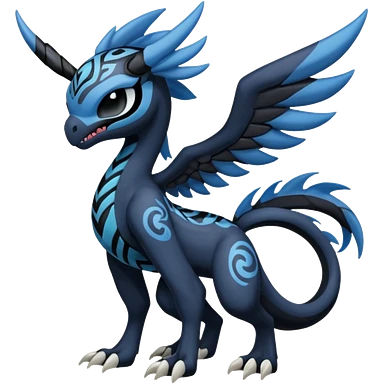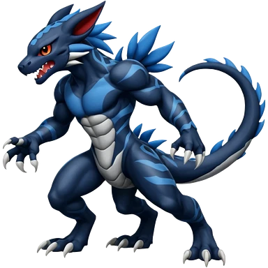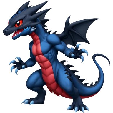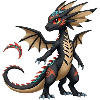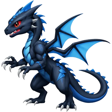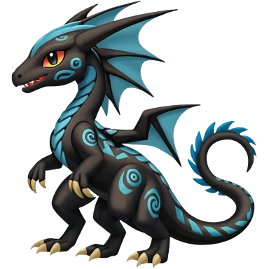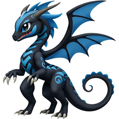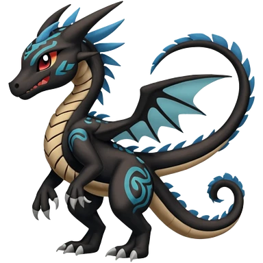Black and Blue Charizard-Stitch-Zekrom-Salandit-Sneasel-fusion, full body, tribal markings emoji