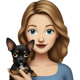 Pretty girl with long wavy brown hair, blue eyes, holding a black and brown short hair chihuahua emoji