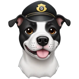 staffy dog has a white face. he has black ears, with a pink hue inside the ear. he has spots, which are on his mane not on his face! he is sitting down and make him look like an apple emoji emoji