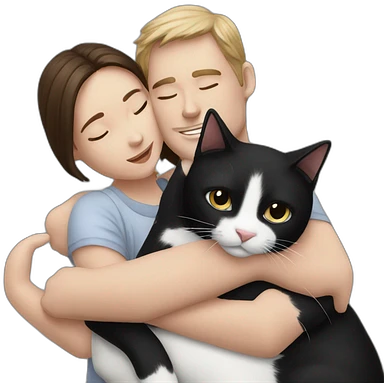 Black and white cat hug with brown hair man and blond women emoji | AI Emoji Generator