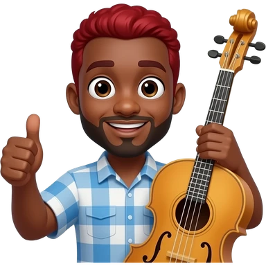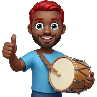 give me a funny black-skinned guy emoji png who's showing with his thumb that everything fine, also on the other hand he holds a jumbo instrument he should have red hair and his eyes being weird wide emoji
