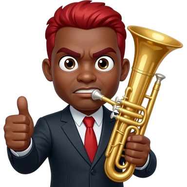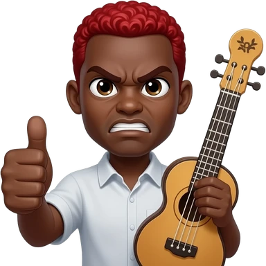 give me a funny black-skinned guy emoji png who's showing with his thumb that everything fine, also on the other hand he holds a jumbo instrument he should have red hair and his eyes being weird wide his face expression should be mad even tho his showing thumb up and hes eyes should be really small emoji