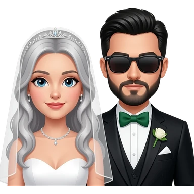 White skin bride and groom. Bride with grey hair and pale skin. Groom with a black suit, green bow tie, black hair and beard and wearing sunglasses emoji