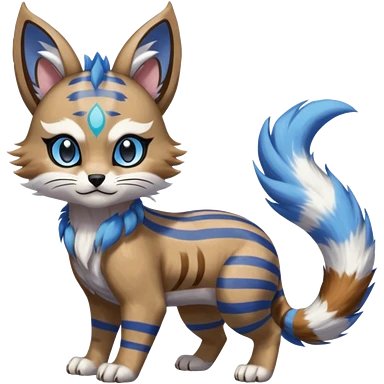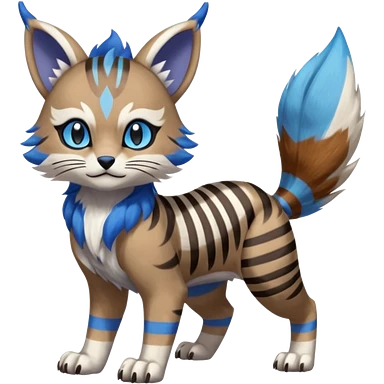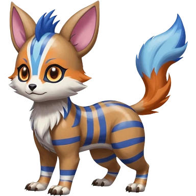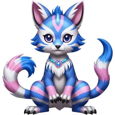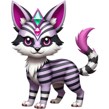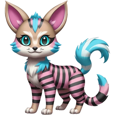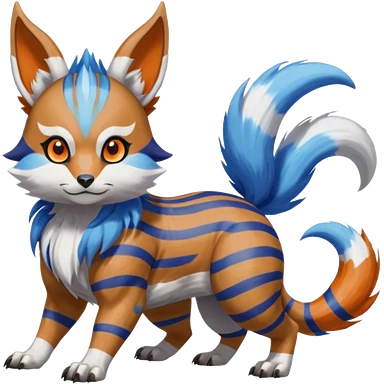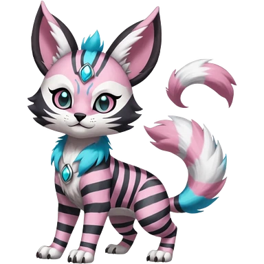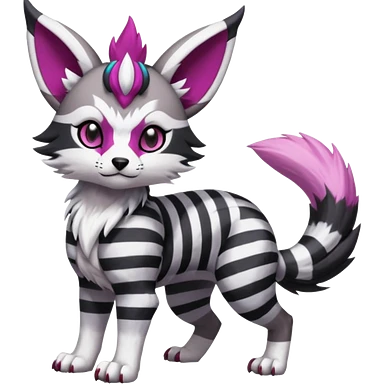 Black and white-striped Colorful Skilled Adept Graceful Asian Painted WereGarurumon-Meloetta-Obstagoon-Furret-fusion-hybrid-creature (full body) with cobalt-sapphire-blue rings around eyes, tufted lynx ears emoji | AI Emoji Generator