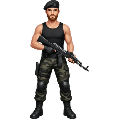 Full body guy wearing combat boots, black bdu pants, black tanktop shirt and black baret red goatee. Holding an AK47 emoji