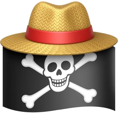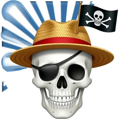 black background, white jolly roger. in his skull head he wear a straw hat with a red headband emoji