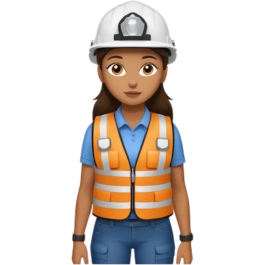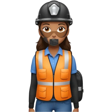 Brunette brown Girl full body standing with her white security helmet and security vest that fits her big on, also with her black backpack emoji