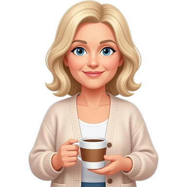 WHITE BLOND WOMAN IN HER 40S WITH SHOULDER LENTH HAIR IN FLOWY CARDIGAN HOLDING A CUP OF COFEE emoji