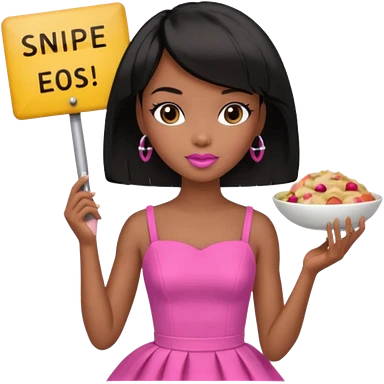 Black barbie, short black bob hair, pink dress eating with a sign that says snipe emoji | AI Emoji Generator