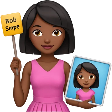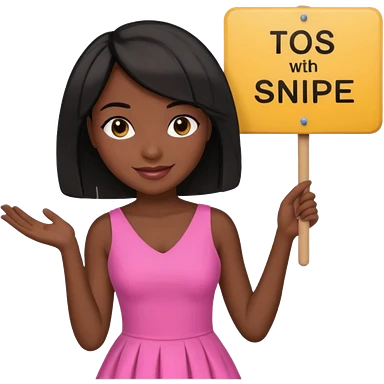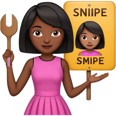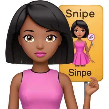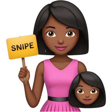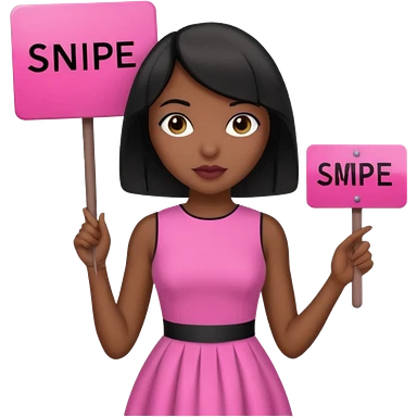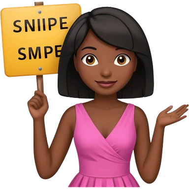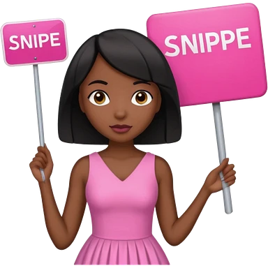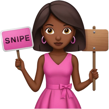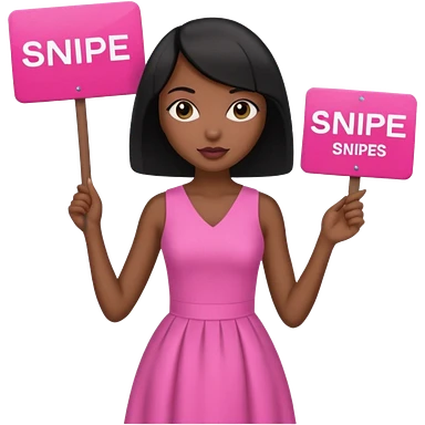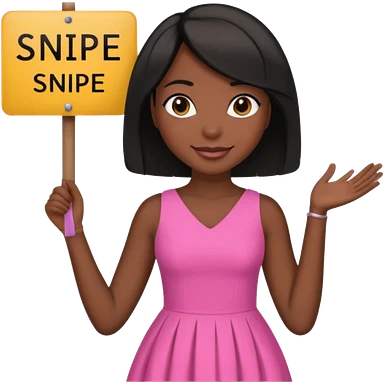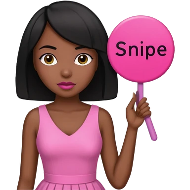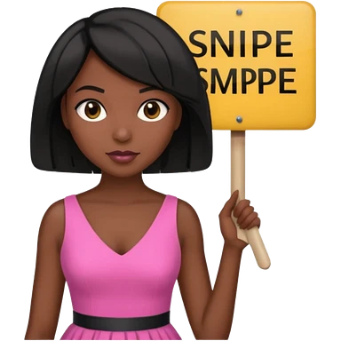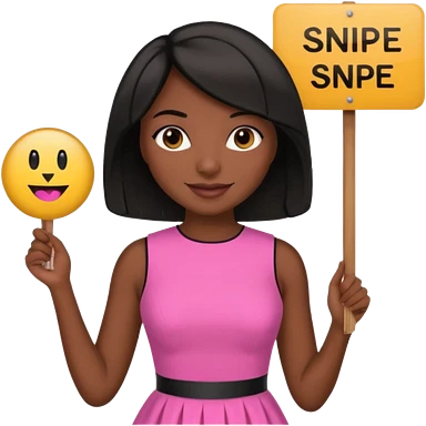 Dark skin woman with black bob in hair holding sign that says snipe wearing pink dress emoji