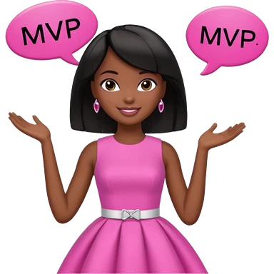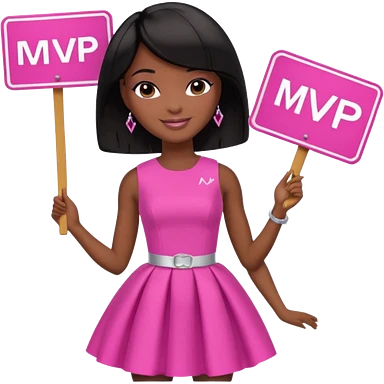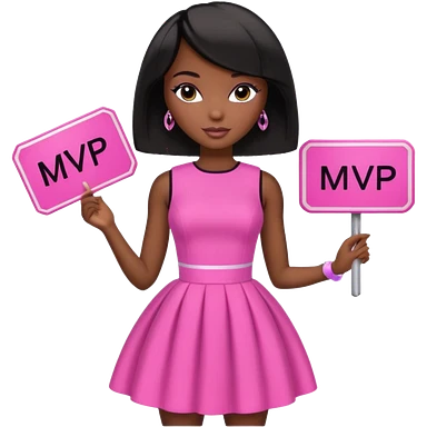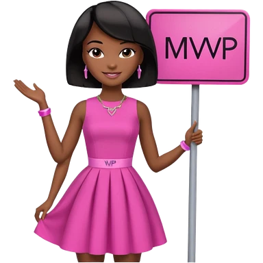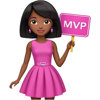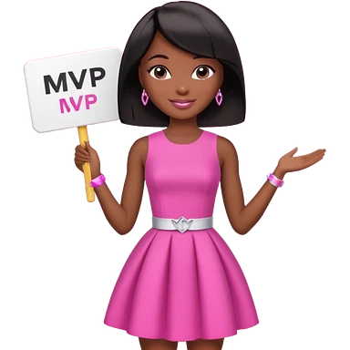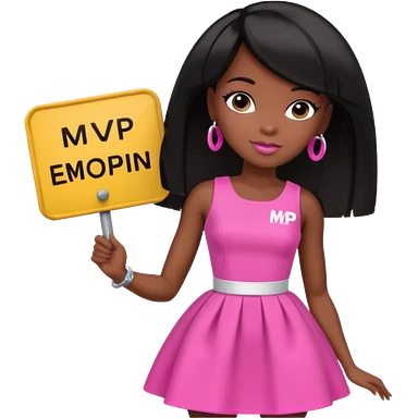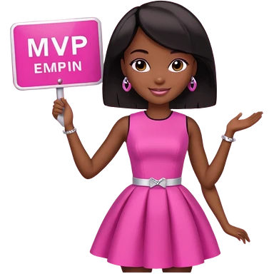 Black barbie, short black bob hair, pink dress with a sign that says mvp emoji