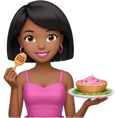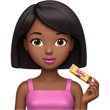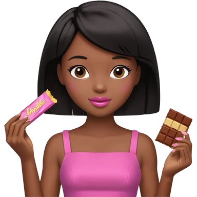 Black barbie, short black bob hair, pink dress eating chocalate bar emoji