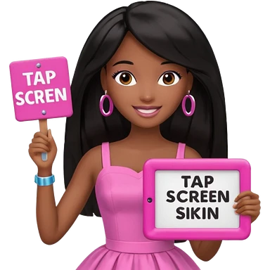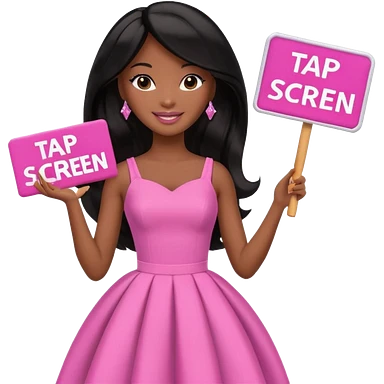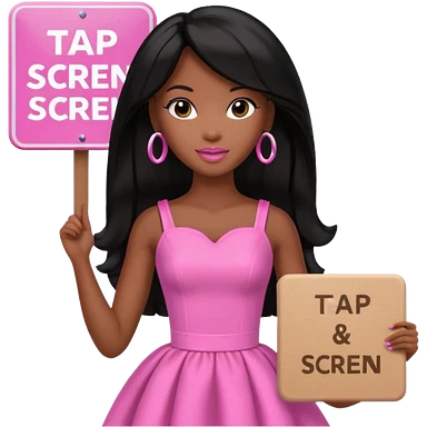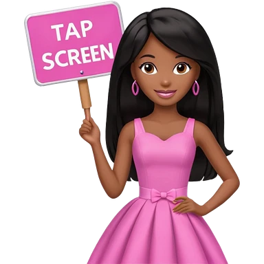 Black barbie, long black hair, pink dress holding sign, that says "tap screen" emoji
