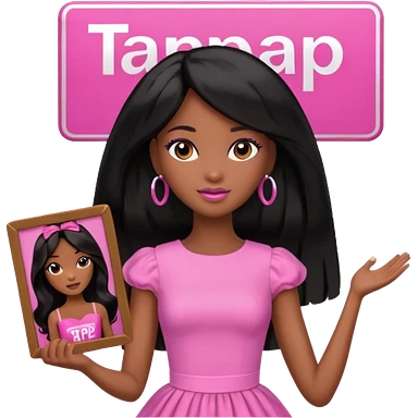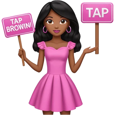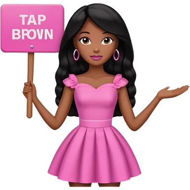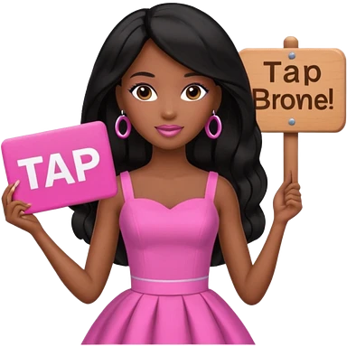 Black barbie, long black hair, pink dress holding sign, that says tap emoji