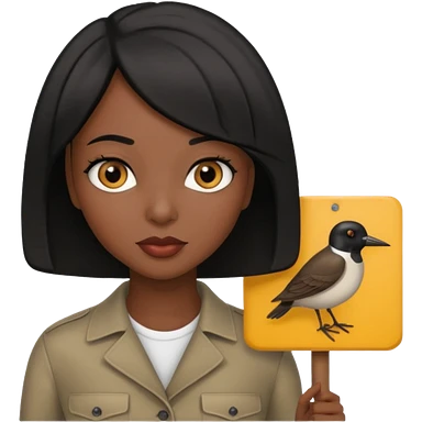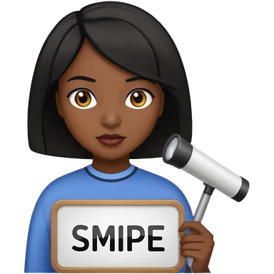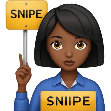 Dark skin woman with black bob in hair holding sign that says snipe emoji