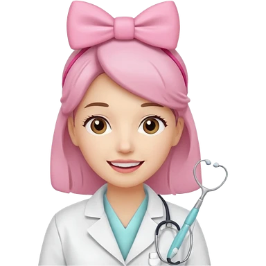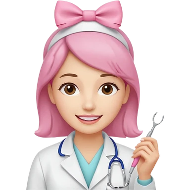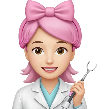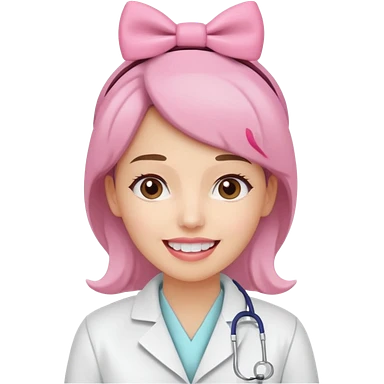 oji style illustration of a female dentist, friendly and smiling, wearing a white coat, with a small pink bow on her head, representing oral cancer awareness, caring and healing, soft colors, simple design, flat illustration, white background. emoji