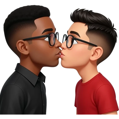 Black boy with black buzz cut hair, glasses, black shirt and Hispanic boy with black buzz cut hair, glasses, red shirt kissing emoji