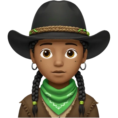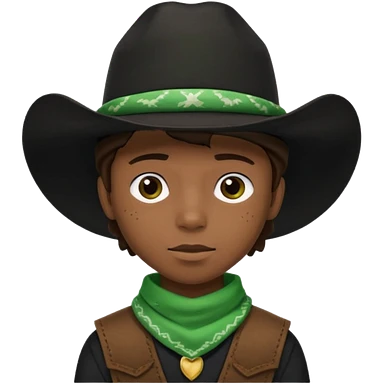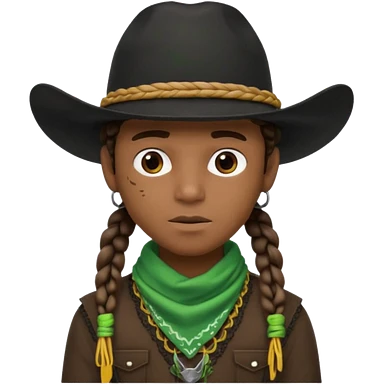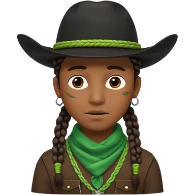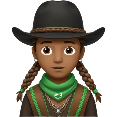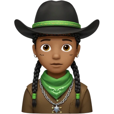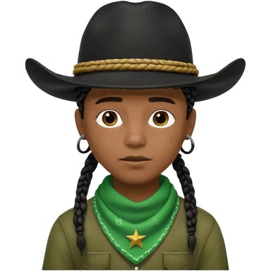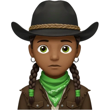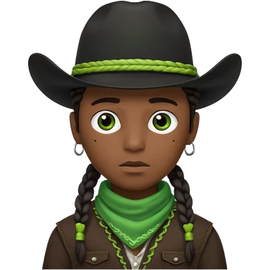 Black boy with three braids near each eye wearing a black cowboy hat with green bandana around his neck emoji