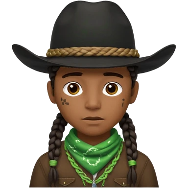 Black boy with 3 braids on each side of face wearing a black cowboy hat with green bandana around his neck emoji