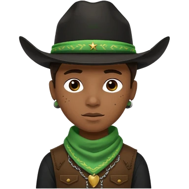 Black boy in black top wearing a black cowboy hat with green bandana around his neck emoji