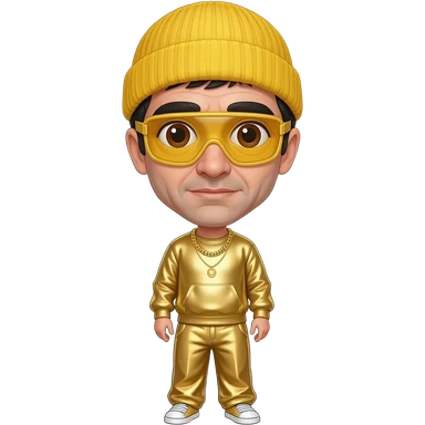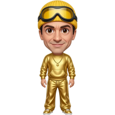 Sacha Baron Cohen with brown eyes, black short hair, yellow goggles, yellow beanie, gold metallic sweatshirt, gold metallic wide leg sweatpants, gold necklace emoji