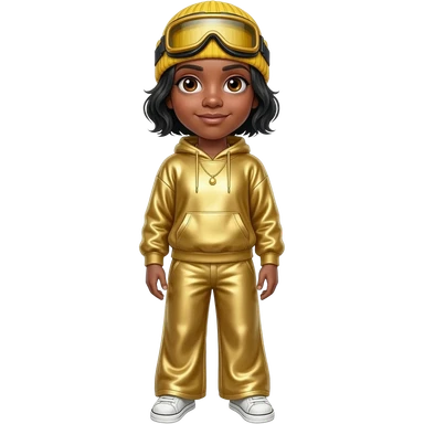 Ali G with brown eyes, black hair, yellow beanie, yellow goggles, gold metallic sweatshirt, gold necklace emoji