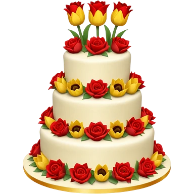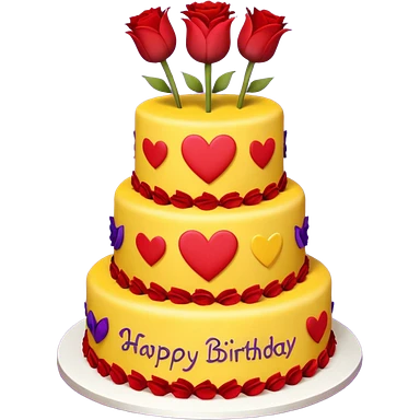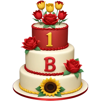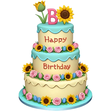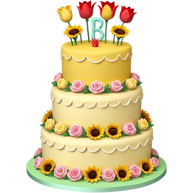 A large three teir cake with first mayer decorated with roses, second with Sunflowers and third with Tulips and Happy Birthday Dear written on top. emoji