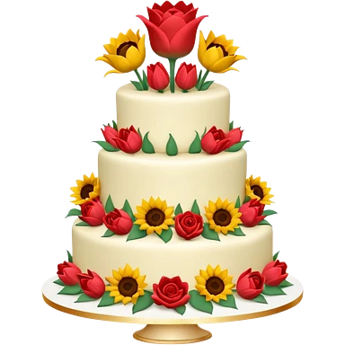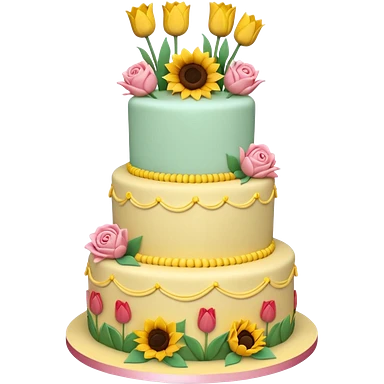 A large three teir cake with top layer decorated with roses, middle with Sunflowers and bottom layerwith Tulips and Happy Birthday Dear written on top. emoji