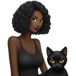 Black hair tied back with strands hanging on the sides, deep brown eyes, wearing square black sunglasses, and holding a cat.” emoji