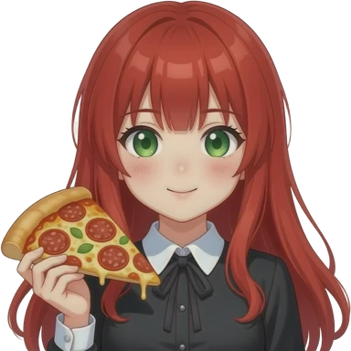 anime girl, holding pizza, red hair, green eyes, black blouse with white collar emoji